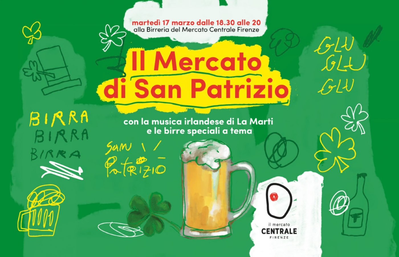Il Mercato si veste di verde con l'accompagnamento musicale di Martina Magionami e la nostra selezione di birre per brindare a San Patrizio! Ti aspettiamo in Birreria dalle 18:30.