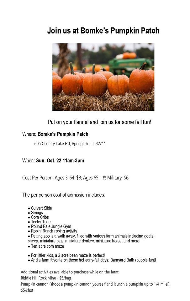 Join us at Bomke's Pumpkin Patch Put on your flannel and join us for some fall fun! Where: Bomke's Pumpkin Patch 605 Country Lake Rd, Springfield, 62711 When: Sun. Oct. 22 11am-3pm Per Person: Ages 3-64: $8, 65+ & Military: The per person cost admission includes: Culvert Slide Swings acre Round Ranch roping activity away filled with various farm animals ncluding goats, pigs, miniature donkey, miniature horse, and maze -Anda farm favorite maze perfect! those early-fall days: Barnyard Bath (bubble fun)! farm: Additional activities available purchase while $5/bag Pumpkin cannon (shoot pumpkin cannon yourself and launch pumpkin p $5/shot mile!)