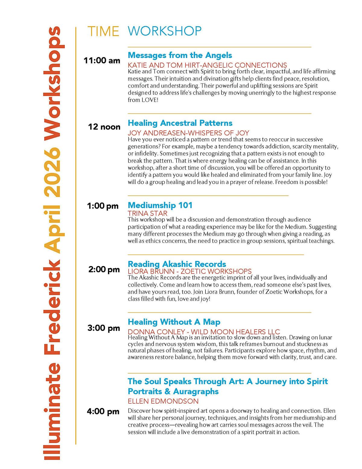 Join us for a wonder-filled day of free educational workshops during the Illuminate Frederick festival. Angel communicators, mediumship, ancestral healing, Akashic records, your personal healing journey, and spirit portraiture are presented in a casual setting - no tickets required, but space is limited.