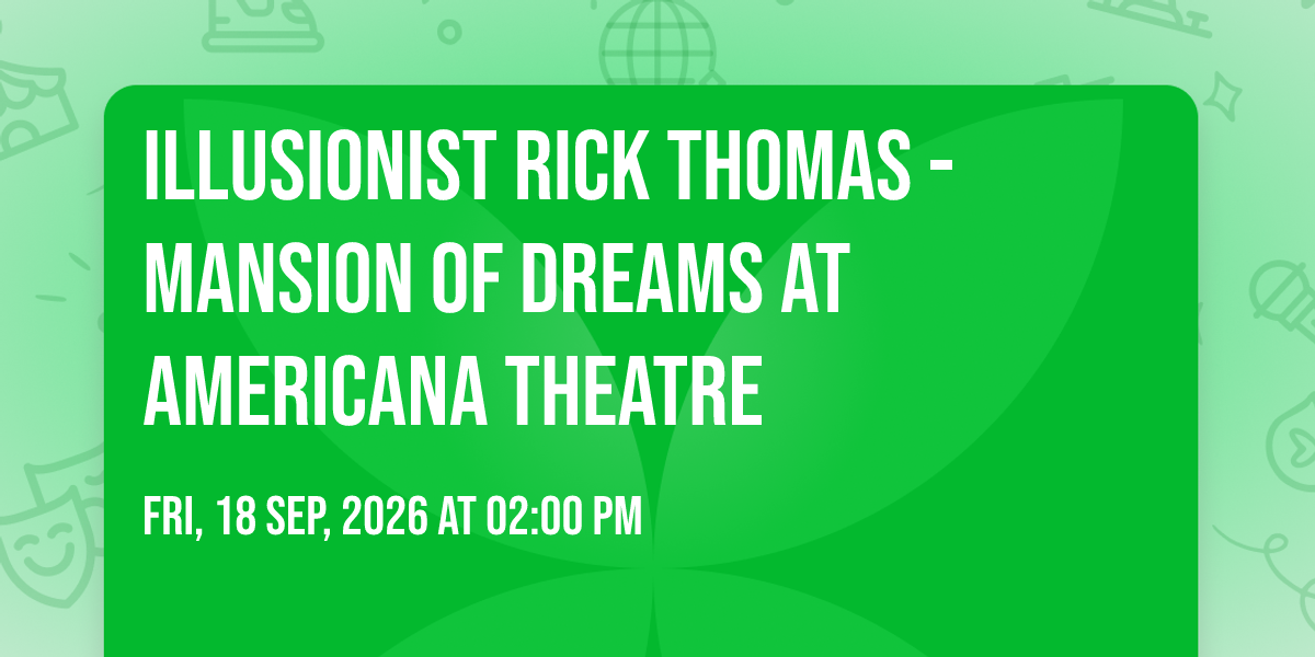 π Welcome to Illusionist Rick Thomas - Mansion of Dreams at Americana Theatre, where the impossible becomes possible and dreams take flight! ποΈ Join us at Americana Theatre in the heart of Branson, MO for an event that will redefine your expectations. π On September 18th, 2026 at 02:00 PM, witness the transformation of space and time into something truly magical. β¨ It's a curated experience combining the best of innovation, entertainment, and community spirit, creating moments that will be remembered for years to come. Whether you're a first-time visitor or a seasoned enthusiast, prepare to be amazed. π Book now to ensure your place in this unforgettable experience!