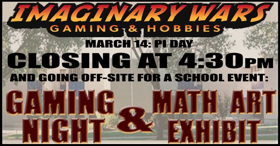 IMAGINARY WARS WILL BE CLOSING EARLY ON MARCH 14, 2024We'll be at a local public school, helping them celebrate Pi Day with their Mathematical Art and gaming event!