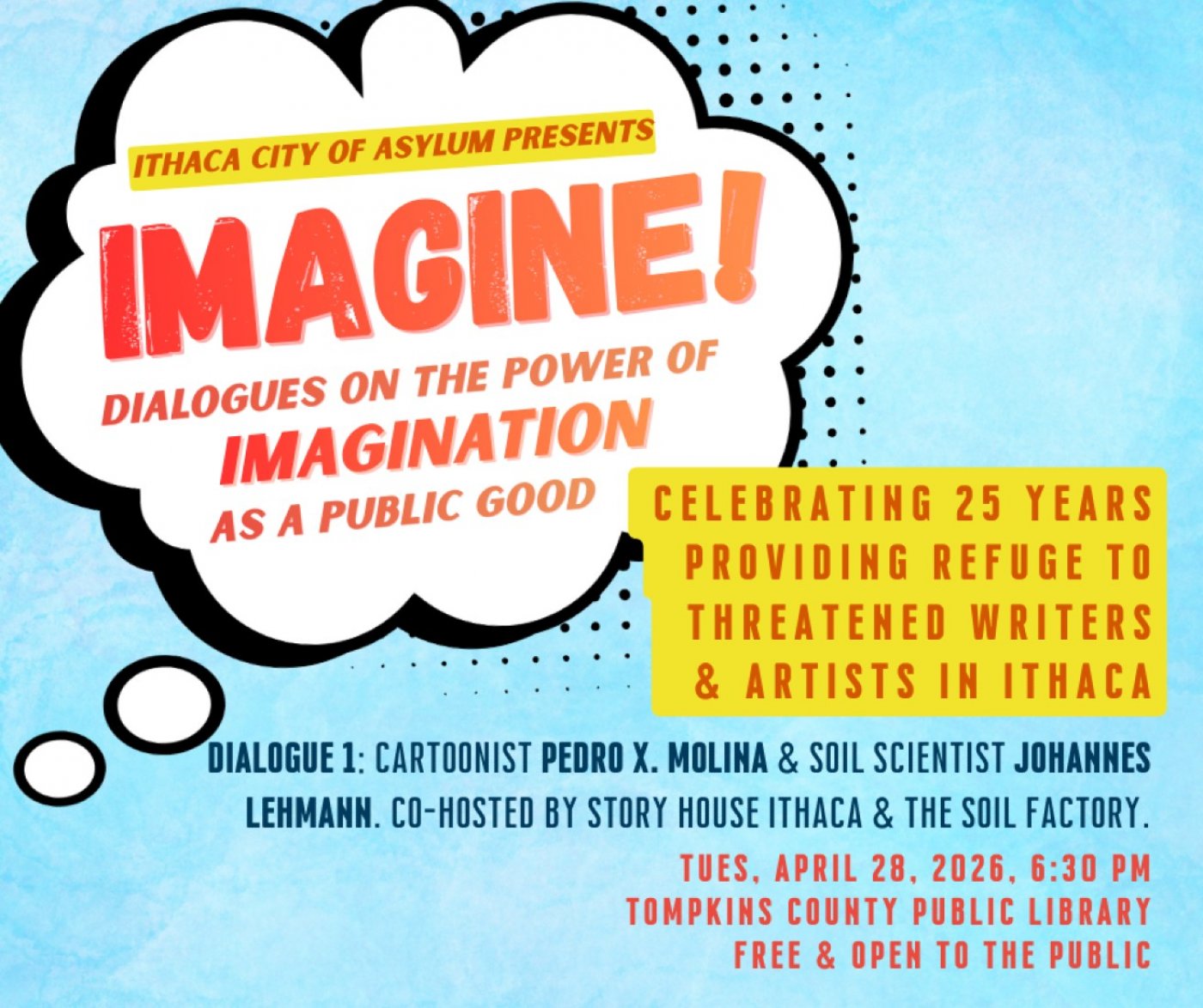 Soil scientist Johannes Lehmann (member of the National Academy of Science) and cartoonist Pedro X. Molina (recipient of the Vaclav Havel Award for Creative Dissent) discuss their recent creative collaboration on a graphic novel titled HUMUS. This is the first event in a series, "Imagine! Dialogues on the Power of Imagination as a Public Good," celebrating the 25th anniversary of Ithaca City of Asylum.