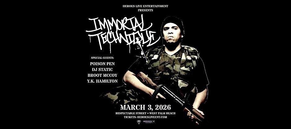 Heroes Live Entertainment presents Immortal Technique with Poison Pen, DJ Static, Broot McCoy, and Y.K. Hamilton on Tuesday, March 3, 2026 @ Respectable Street in West Palm Beach. This is the rapper/activist's first Florida show since 2019.