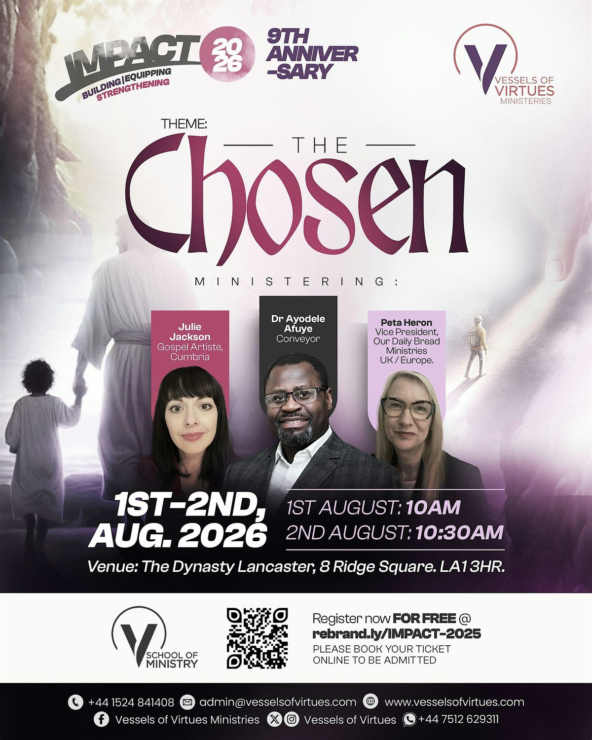 IMPACT is held annually in the City of Lancaster. The event features worship, teachings, and a series of talks. Speakers are usually invited from various churches within the United Kingdom, as we are a network of believers across various denominations, but “making Christ known” stands as the core of our vision. This event will be advertised globally on all our social media platforms. Therefore, we are expecting people from a number of cities within and outside the UK, as Vessels of Virtues Ministries’ membership is global.