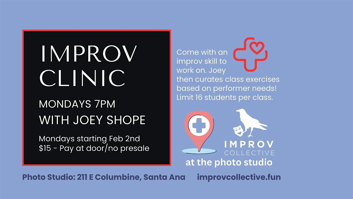 Hi improv performers and students! What skills are you working on? Come tell Joey Shope at his new Improv Clinic series with the Improv Collective! Joey will take the class needs and curate exercises so get reps in your focus areas. Each class is independent, so come to the clinic weekly or whenever you need polish! There is no presale, each class is paid for on-site. Additionally, each class has a cap of 16 students so you get the attention you deserve! **THIS CLASS TAKES PLACE AT THE PHOTO STUDIO IN SANTA ANA!**
