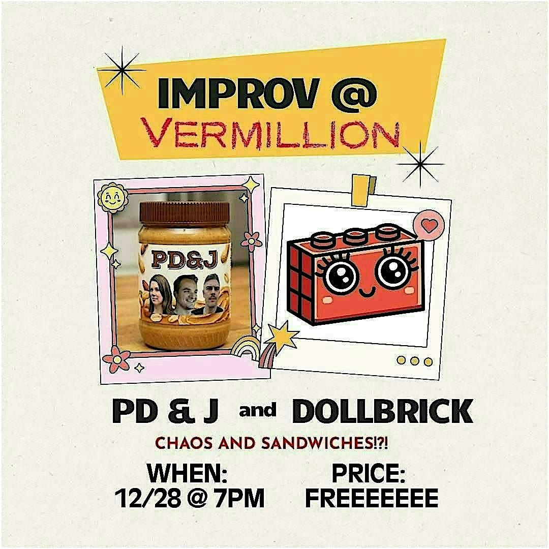 Join us for an unforgettable evening of improvisational comedy at Vermillion Art Gallery and Bar, featuring two of Seattle’s dynamic improv ensembles: Dollbrick Improv Collective and PD&J In this lively bar setting, both groups will deliver their unique styles of spontaneous storytelling and humor, each performing a set of their own. The night culminates in a collaborative performance, blending the talents of both troupes for an unscripted adventure filled with unexpected twists and laughter. Come prepared for a night of interactive entertainment where your suggestions shape the show!