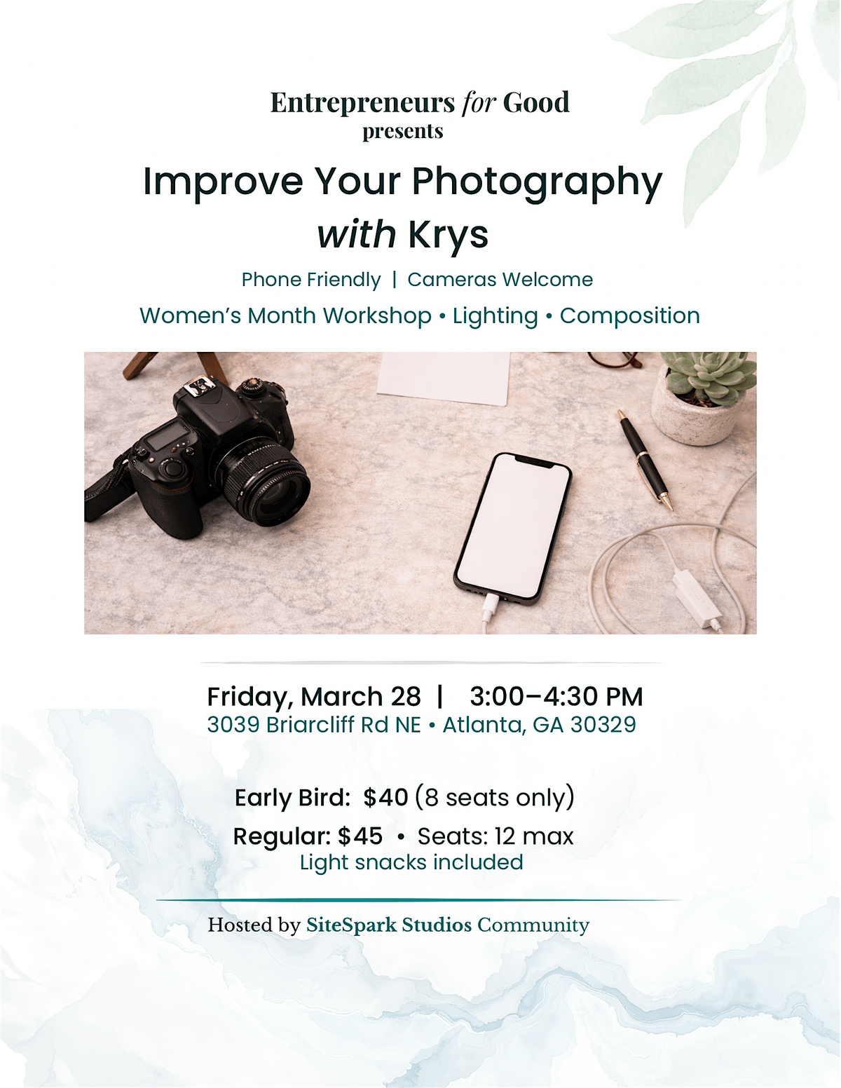 - One product/item to photograph (optional)Light snacks included.