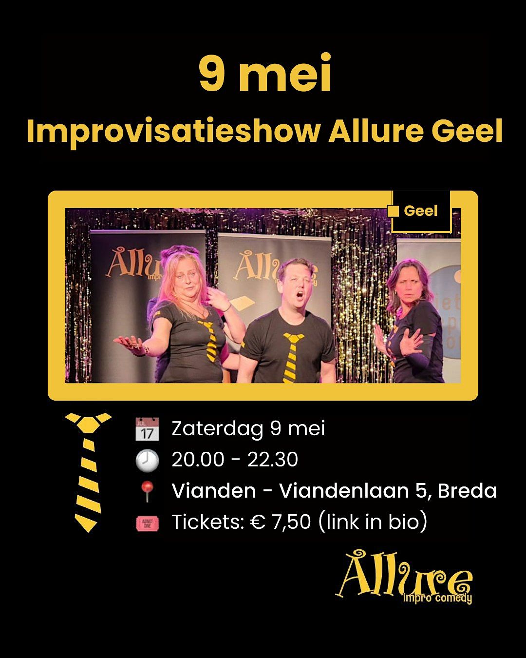 Op zaterdag 9 mei staat Allure Geel op het podium met een improwedstrijd. Alle scènes ontstaan ter plekke. Jullie input bepaalt de scènes.