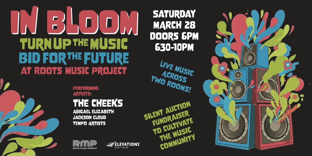 Get ready for an evening where music meets mission! In Bloom is Roots Music Project's spring silent auction fundraiser, featuring live performances across two dynamic rooms. Enjoy headlining indie/funk from Denver's The Cheeks, plus a curated lineup including indie folk storyteller Abigael Elizabeth, eclectic alt-rocker Jackson Cloud, and emerging TEMPO Artists.