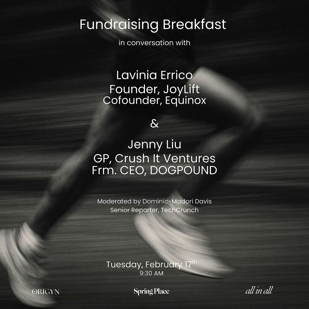Join us for an intimate Fundraising Breakfast featuring Lavinia Errico, Founder of JoyLift & Co-Founder of Equinox and Jenny Liu, General Partner at Crush It Ventures and former CEO of DOGPOUND. Lavinia and Jenny will share their insights on or to build globally recognized brands and their investment thesis at the intersection of longevity, health, wellness, and fitness, offering insights into where the most compelling opportunities are emerging and how founders should think about building in this rapidly evolving space.