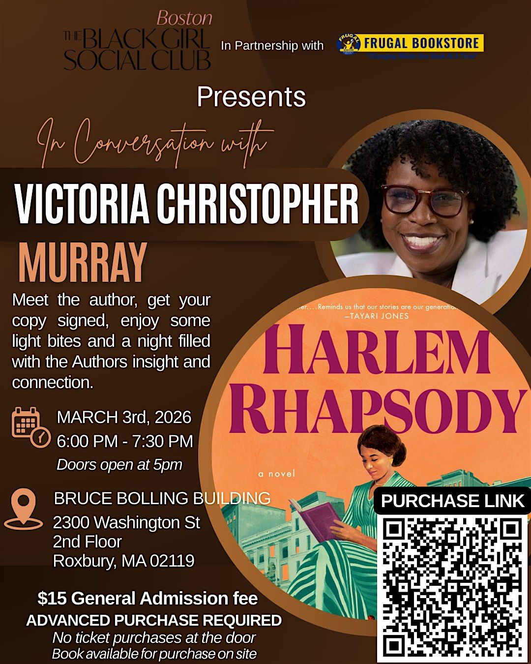Join The Black Girl Social Club- Boston Chapter in partnership with Frugal Bookstore for an unforgettable evening with , celebrated author and NAACP Image Award winner, as she discusses her powerful latest release, Harlem Rhapsody. This facilitated conversation will explore the inspiration, historical depth and resonant themes behind the novel- spotlighting Black brilliance, womanhood, ambition and legacy.