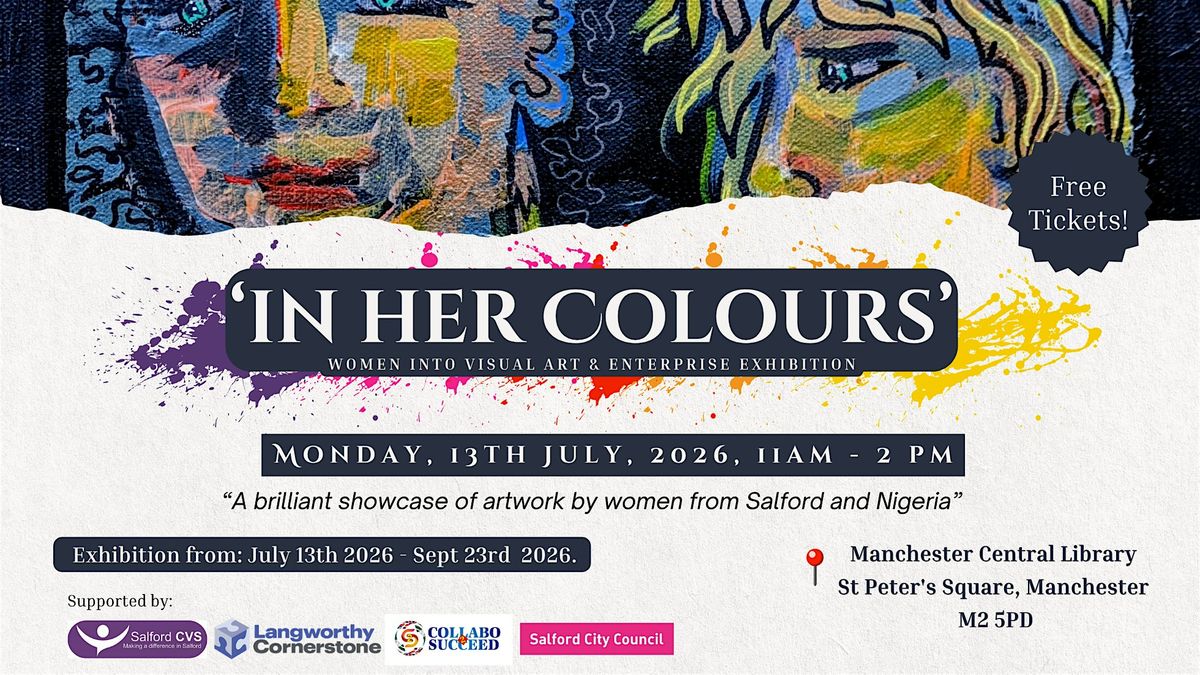 The Open Day Event for the Exhibition is a free in-person community event on Monday 13th July, 2026, 11am-2pm. showcasing vibrant Visual Art pieces that bring creativity to life. This Summer Exhibition at Manchester Central Library will run from 13th July to 23rd September, 2026 with a brilliant showcase of artwork by women from Salford and Nigeria. Whether you're an art lover or just curious, it's a great chance to see the power of creativity of local artists and the Nigerian excellence!