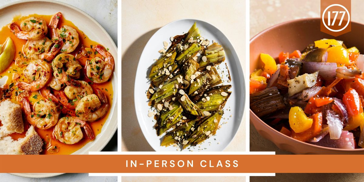 You'll start with pinchos morunos, pork tenderloin bites that trace their origins to the Moorish spice routes of southern Spain. Fragrant with cumin, coriander and smoked paprika, these super-savory snacks are leveled up with a good sear and a punchy lemon-honey glaze. We'll tackle gambas al ajillo, the garlicky shrimp dish that appears on nearly every bar menu from Madrid to Málaga, getting the technique just right so the oil becomes a richly flavorful sauce in its own right. A medley of roasted vegetables finished in sherry vinegar follows, teaching you how acid can transform a simple dish into something bright and complex. Finally, braised leeks in the best-quality Spanish olive oil, served atop crunchy olive oil tortas, will correct any misguided ideas that vegetables play second fiddle on the Spanish table.