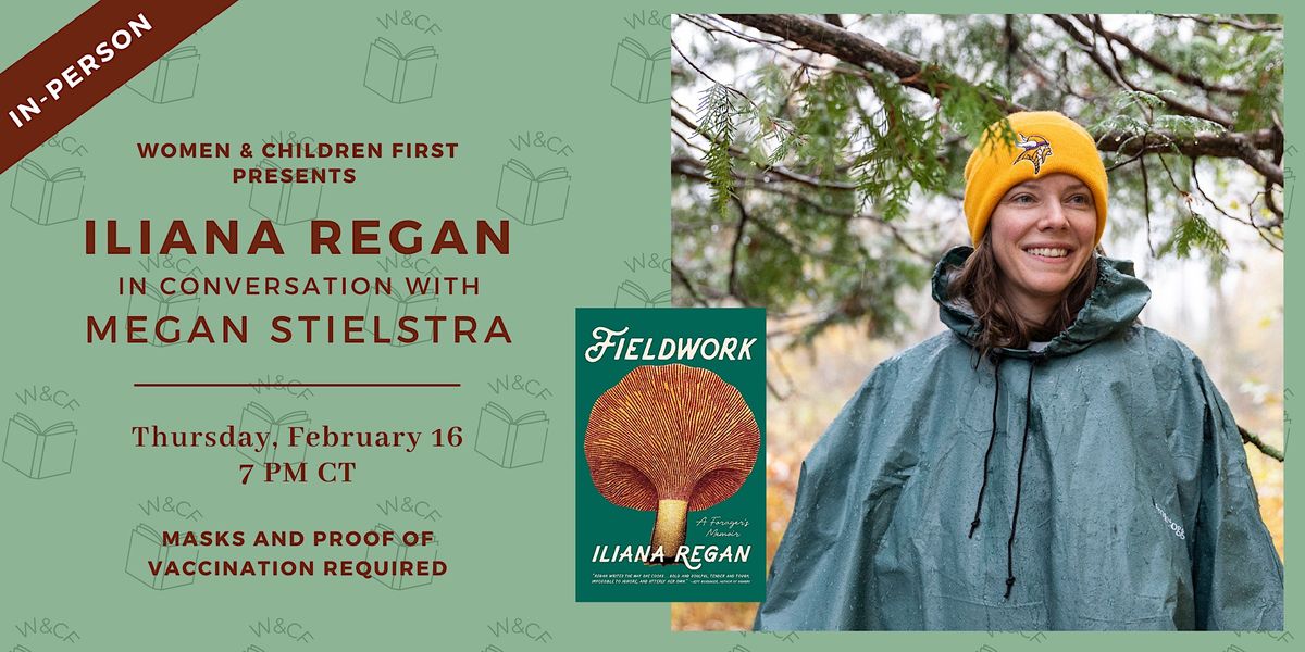 Image Description: A banner with a light green background and the faint pattern with open books. A small photo of of the book cover, FIELDWORK, is centered next to a large photo portrait of the author, Iliana Regan. The text reads, "Women & Children First presents Iliana Regan in conversation with Megan Stielstra, Thursday, February 16, 7PM CST, masks and proof of vaccination required."