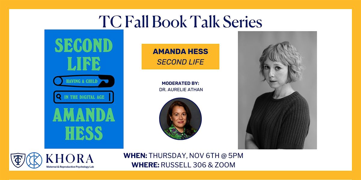 On Thursday, November 6th, 2025 (5:00–6:00 pm ET), KHORA: Maternal & Reproductive Psychology Lab and Gottesman Libraries are delighted to welcome Amanda Hess for a discussion of her book Second Life (2025).