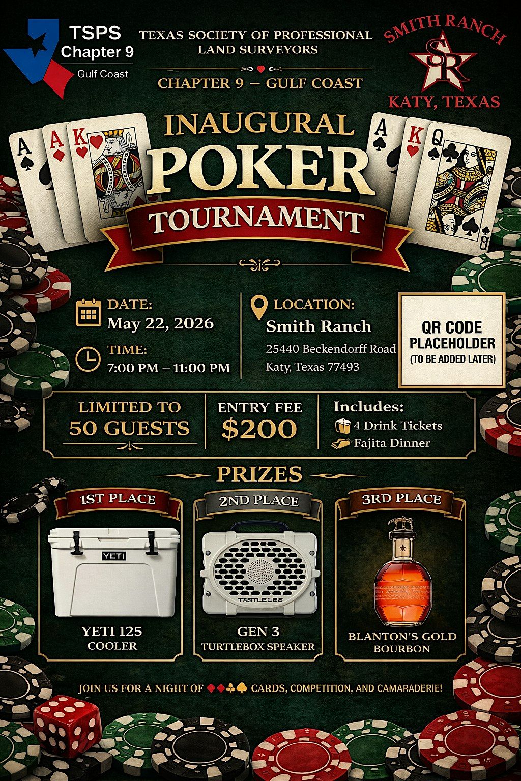 Join us live for the Inaugural TSPS Chapter 9-Golf Coast Poker Tournament—fun, cards, and cool vibes!About this Event