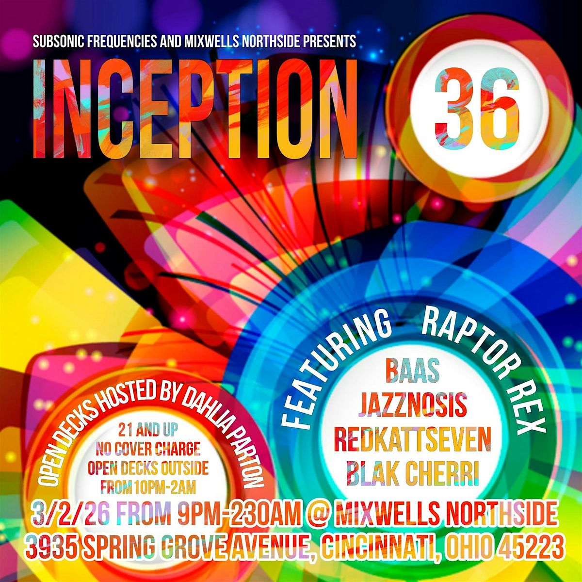 MixWells Northside and Subsonic Frequencies present Inception, a monthly EDM community gathering on the first Monday night of each month with open decks from 10pm-2am outside in the courtyard, a set from host redkattseven from 9:30pm-1030pm inside, and four different featured DJs each month playing inside from 10:30pm-230am. Our featured DJs for the thirty sixth edition of Inception are Raptor Rex, Baas, Jazznosis and Black Cherri!