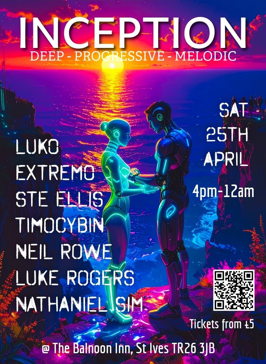 @ THE BALNOON INN - ST IVESSATURDAY 25TH APRIL 4pm - 12amInception presents... The Engagement!A day to night event - Deep House - Melodic - Progressive - Techno