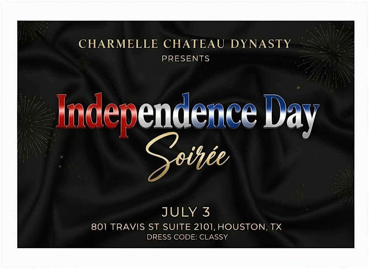 Welcome to the Independence Day Soirée Houston Edition! 🎆 Celebrate freedom and community at Charmelle Chateau Dynasty HQ on July 3, 2026, at 6:00 PM (Central Time). Join us for a night of music, dancing, and patriotic vibes. Don’t forget to wear your best red, white, and blue attire! Let’s make this a night to remember. See you there!
