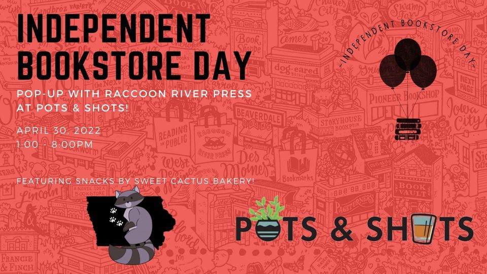 Join Raccoon River Press in celebrating Independent Bookstore Day! We will be at Pots and Shots from 1:00pm - 8:00pm.Stop by for books, cookies (by Sweet Cactus Bakery), a copy of the Indie Bookstore Roadmap, and more!