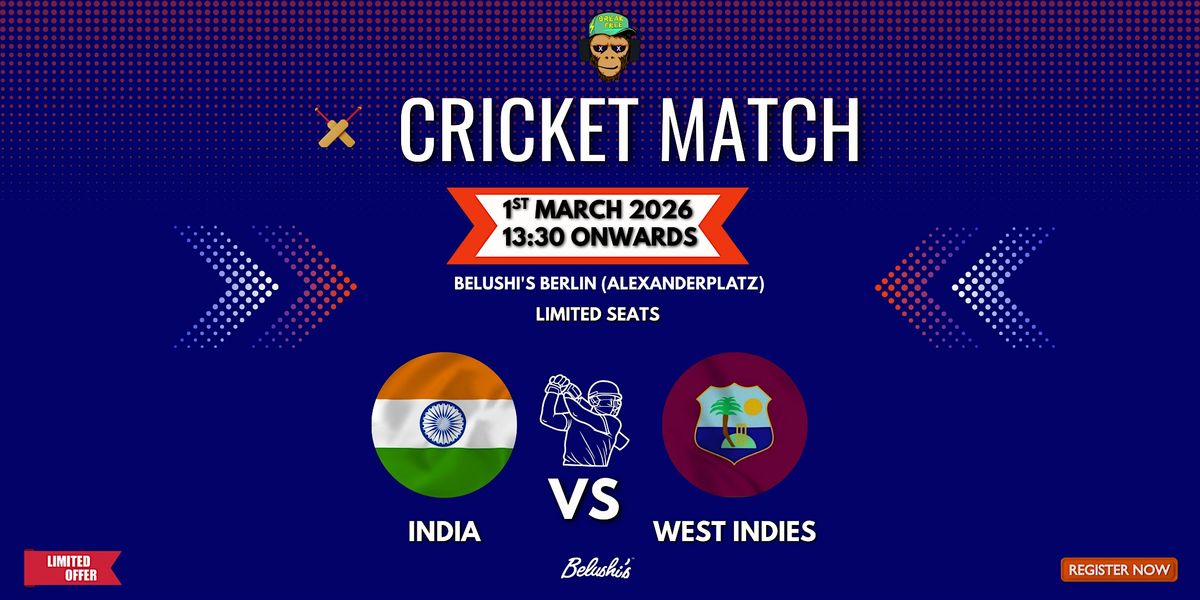 Join fellow fans at Belushi’s Berlin (Alexanderplatz) for the decider match between India and West Indies — a game that will determine whether India makes it to the Semi-Finals!
