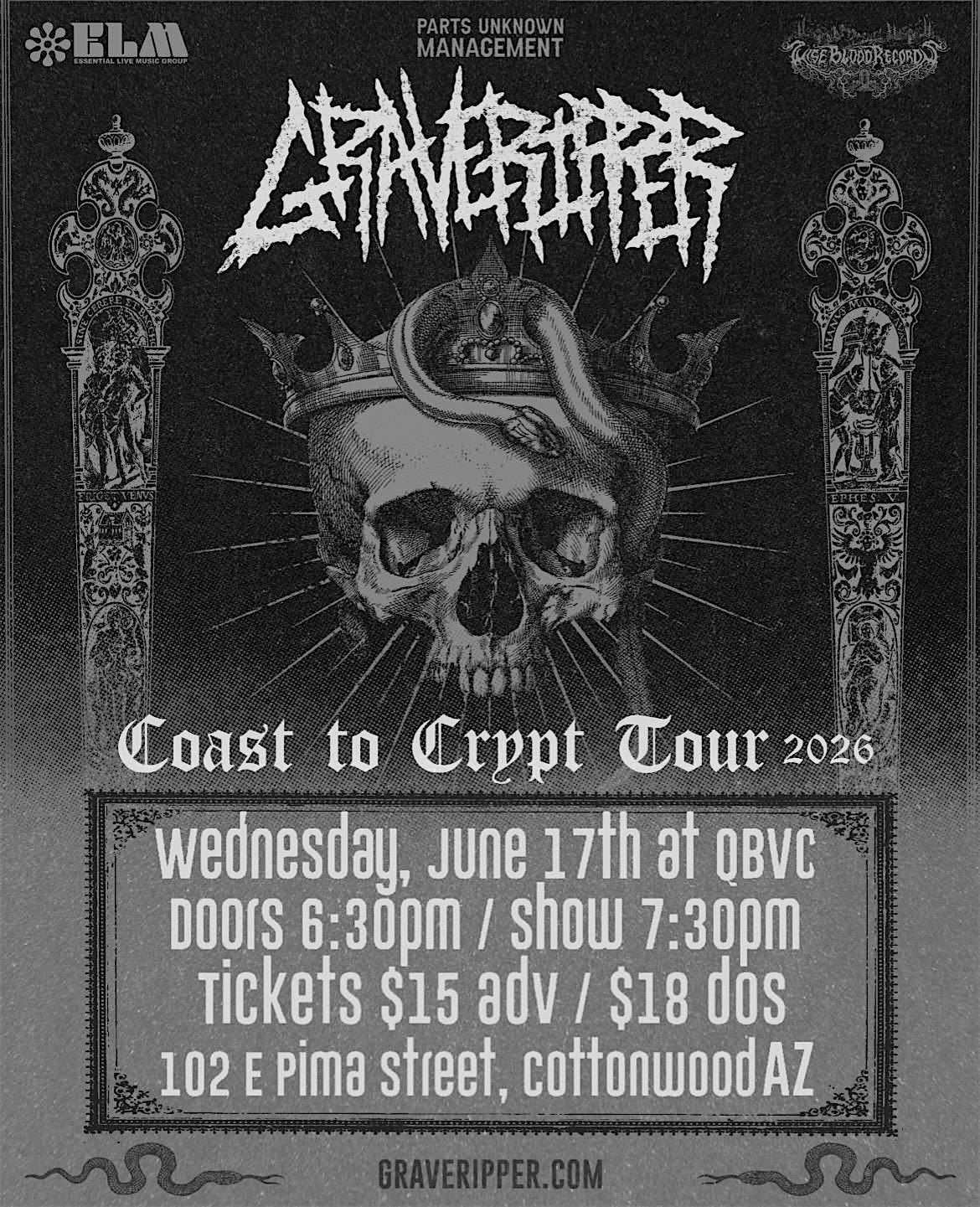Crawling from the Tomb of Oppressors... Graveripper tears out of the decayed dirt to put on a show of a lifetime! Vicious riffs bring the Hexenhammer down on this thrash of a night. Let the dissonant drumbeats guide you to the hallowed halls of Queen B Vinyl Cafe!