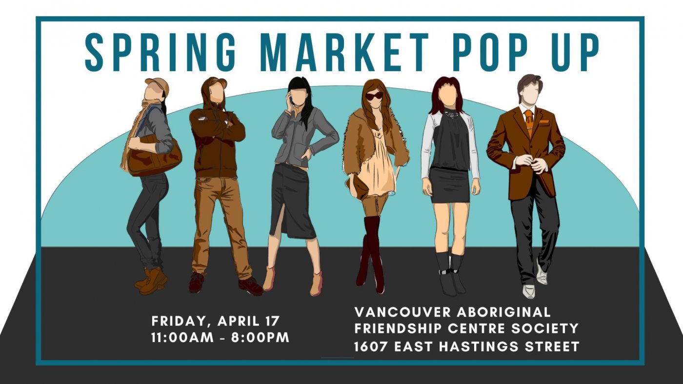Spring Market Pop-Up Sale located at, Vancouver Aboriginal Friendship Society at 1607 E. Hastings Street, Vancouver. Presented by The Indigenous Digital Accelerator - Capilano University. Indigenous vendors selling handmade jewelry and crafts plus fashionista vintage & pre-loved clothing - April 17, 11AM -8PM. Featuring shopping beats by DJ. Kookum.