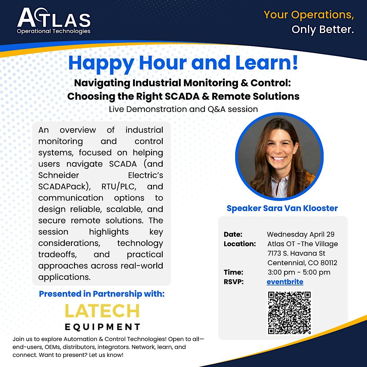 Presented by: Sara Van Klooster: is a Client Solutions Manager at LaTech Equipment with 20+ years of experience spanning business development, environmental engineering, consulting, and industrial sales, focused on delivering SCADA and remote monitoring solutions.