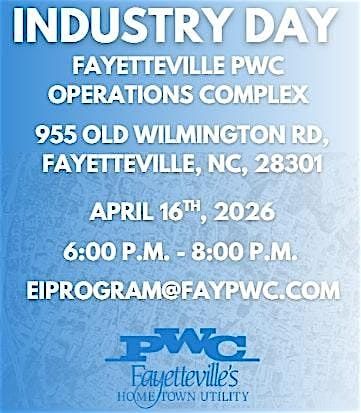 The Fayetteville Public Works Commission (PWC) invites local business owners, entrepreneurs, and industry professionals to attend itsfifth Annual Industry Day on Thursday, April 16, 2026, from 6:00 p.m. to 8:00 p.m. at the PWC Operations Complex, 955 Old Wilmington Road, Fayetteville, N.C.
