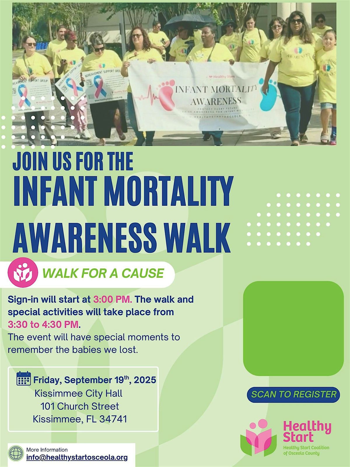 Come join us for the Infant Mortality Awareness Walk starting and ending at Kissimmee City Hall! Let's walk together to raise awareness about infant mortality and support families affected by this issue. This in-person event is a great opportunity to show your solidarity and make a difference in our community, especially as we remember the babies we lost last year. Don't miss out on this chance to come together and make a positive impact. See you there!