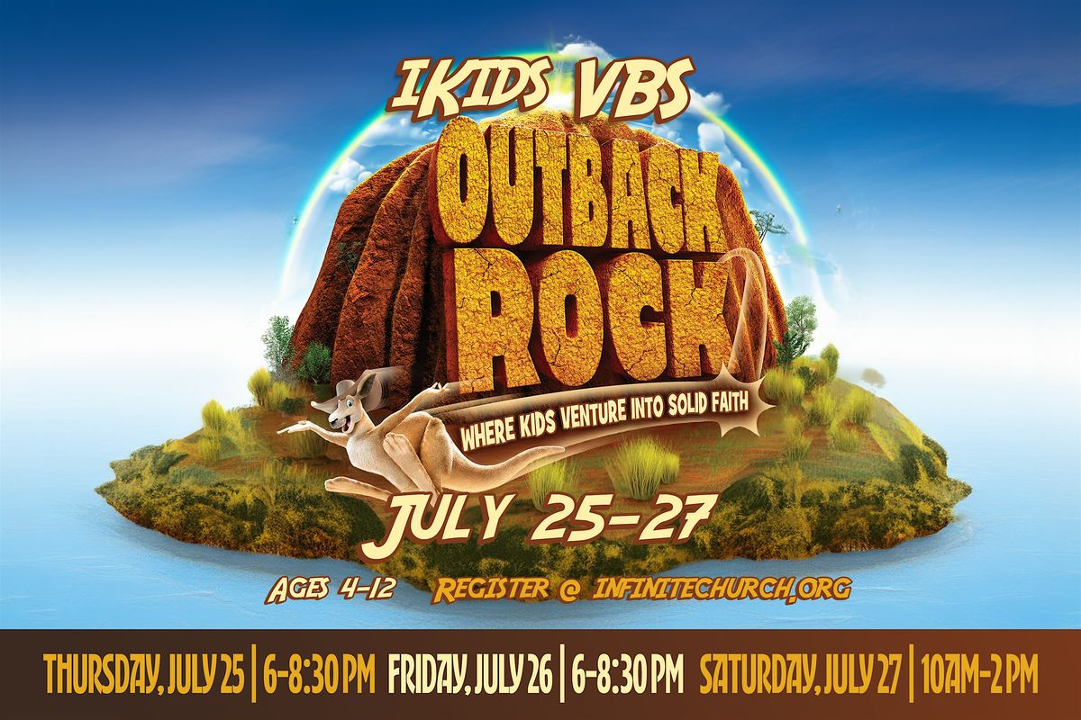 Join us for Infinite Church VBS 2024: Outback Rock! We welcome all kids 4-12 years of age to venture into solid faith this year! On this Aussie adventure, we'll explore God’s monumental love and discover unshakable faith. It’ll be a bonzer of a time, July 25th and 26th from 6 to 8:30pm, then gather round the barbie with us for our Family Fun Picnic on July 27th from 10 to 2pm! We can't wait to see you there mate!