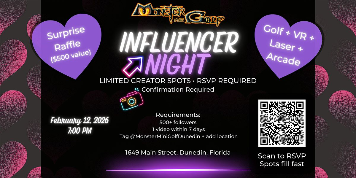 Content creators, this one’s for you. Kick off Valentine’s weekend with an Influencer Night at Monster Mini Golf Dunedin. Your RSVP includes free mini golf, free laser maze, one VR session, and a $5 arcade card. Check in 6:30–6:45 PM, group clip at 6:50 PM, then create and play from 7:00–9:00 PM. Limited spots and RSVP required. Must have 500+ followers and post one tagged video within 7 days.