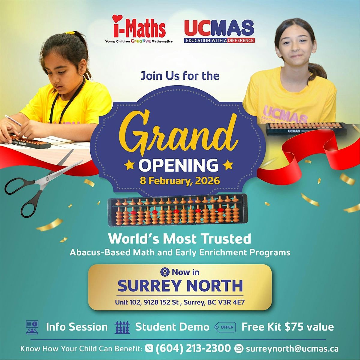 Join us for an exciting UCMAS Information Session and Grand Opening for our new branch in Surrey North. This free session is perfect for parents curious about how UCMAS helps children aged 4–13 build sharper minds, stronger focus, and better math skills — all through our fun and engaging Abacus-based Mental Math program.
