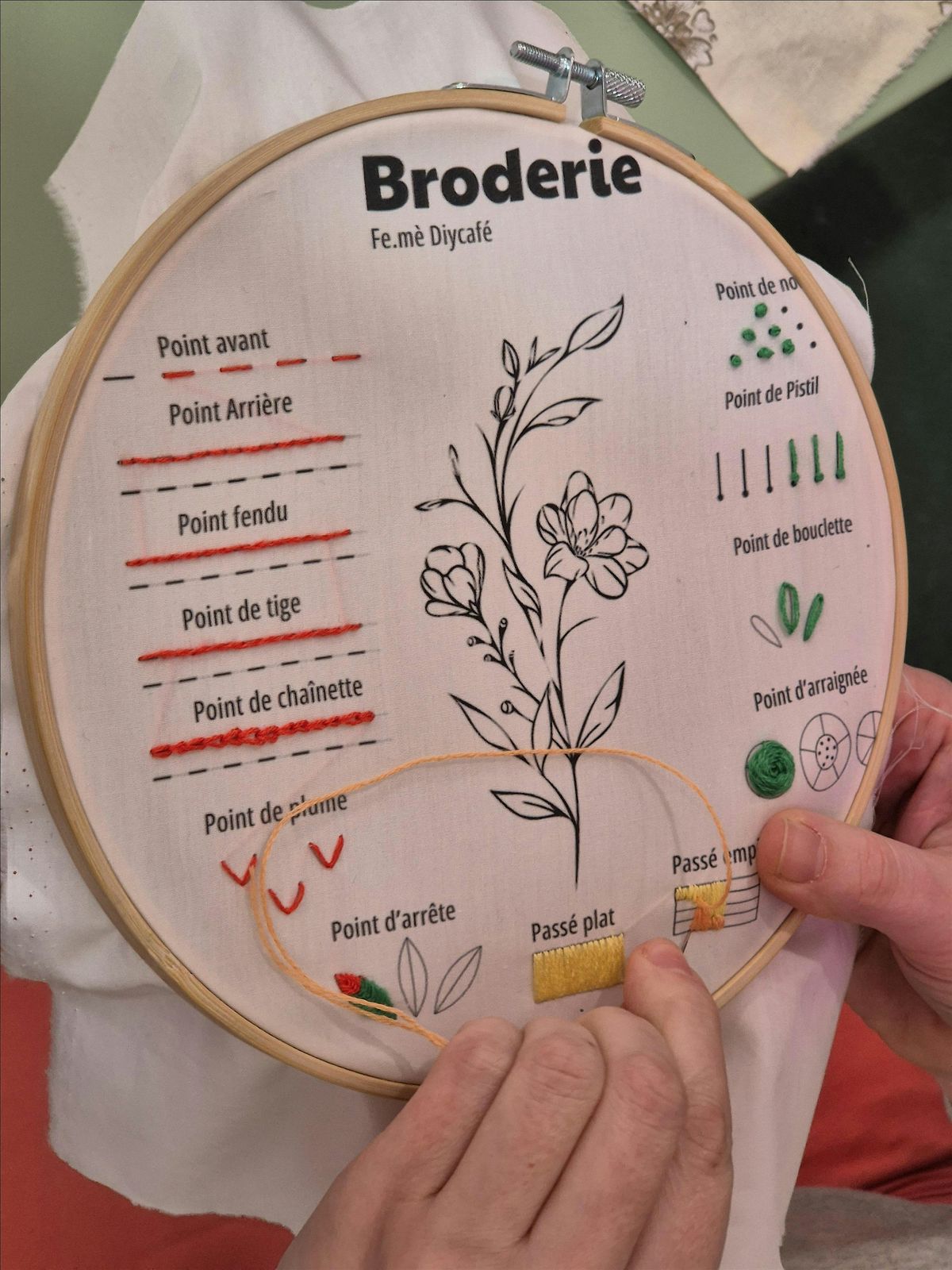 Viens découvrir l'art de la broderie en mode détente et bonne humeur ! Que tu sois débutant.e ou juste curieux.se, cette session en présentiel est parfaite pour apprendre les bases, t'amuser et repartir avec ta création. Pas besoin d'expérience, juste envie de tester quelque chose de nouveau et de créatif. On t'attend pour un moment convivial entre passionné.e.s de fil et d'aiguille !