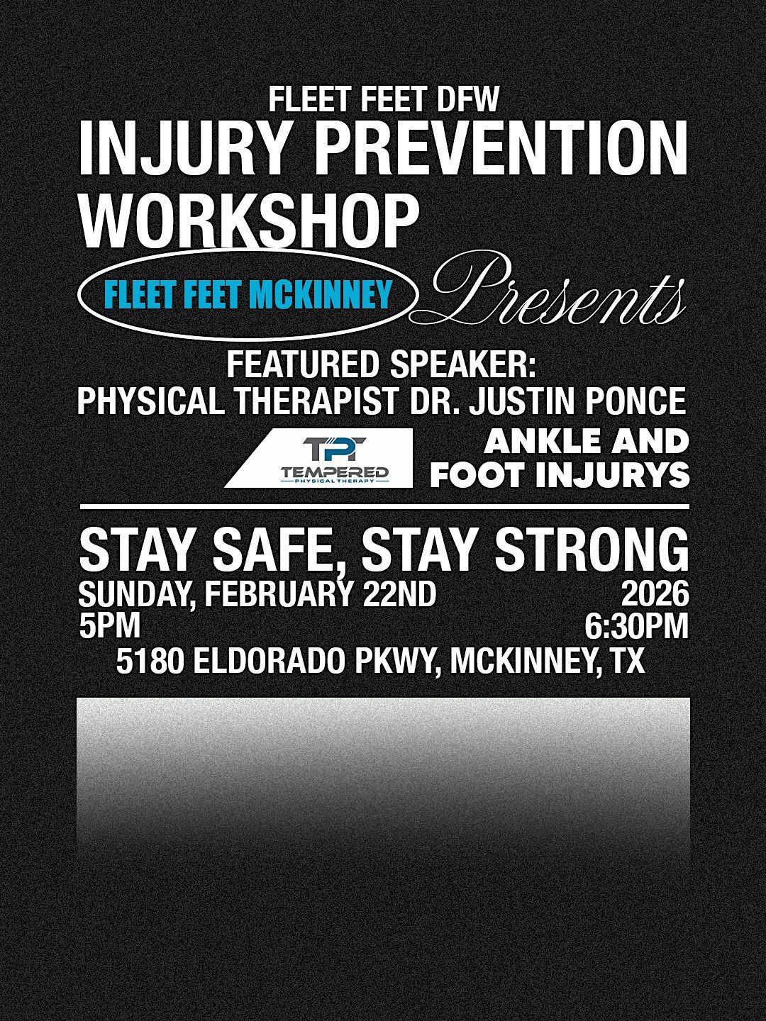 Running and walking should build you up, not break you down. Join Fleet Feet McKinney for an injury prevention workshop with Physical Therapist Dr. Justin Ponce, focused on the most common ankle and foot issues that sideline runners and walkers.