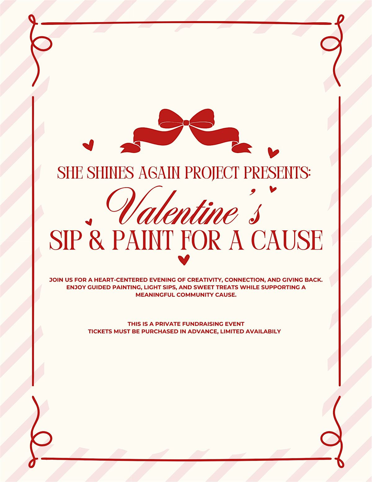 Get ready for a fun-filled evening at our Ink and Shine Valentines Sip & Paint event! Join us in person to sip, paint, and celebrate love while supporting a great cause. Whether you're coming with friends, your special someone, or flying solo, this is the perfect chance to create something beautiful and make a difference. Bring your creativity and your smile – we’ll provide the rest!