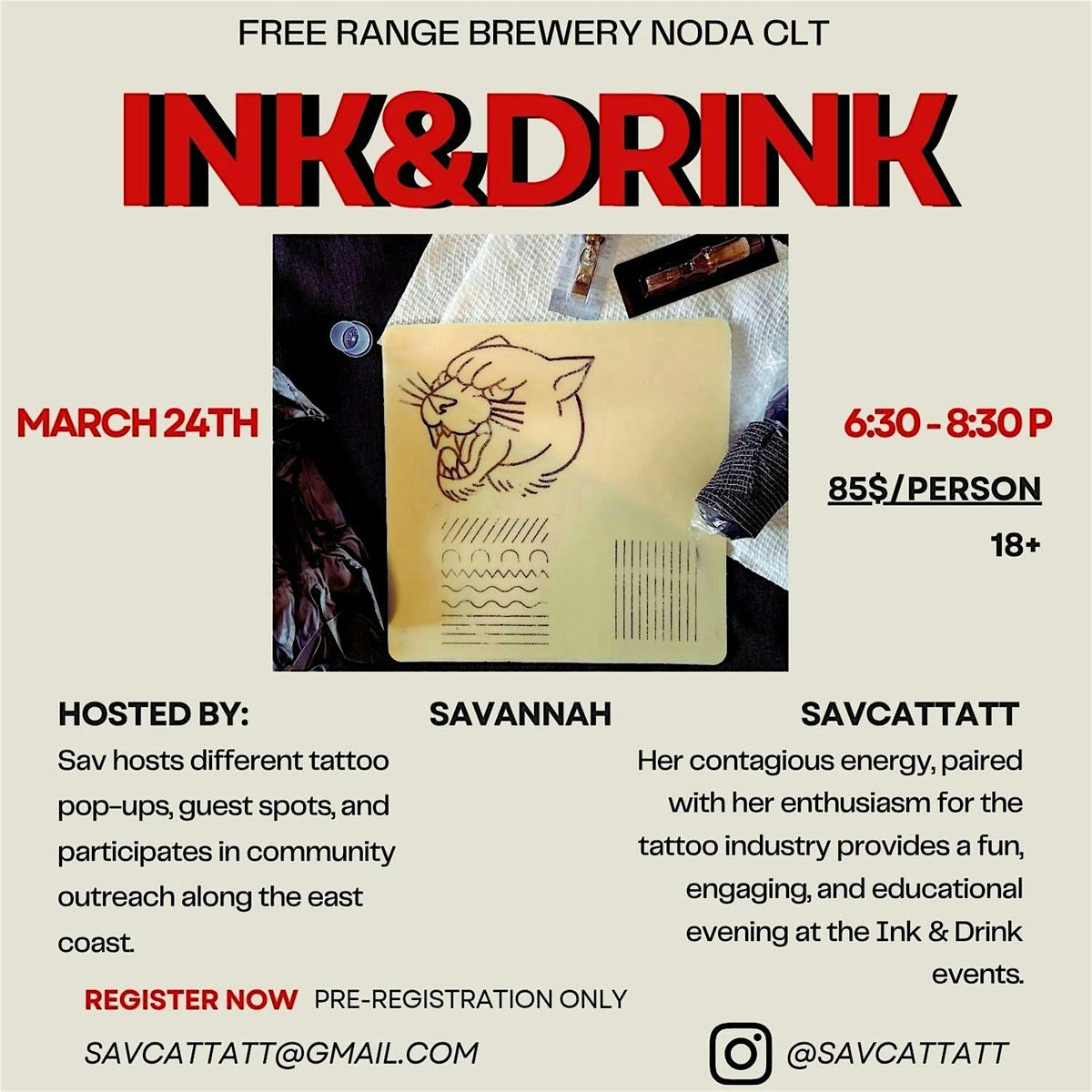 Join us Free Range Brewery NoDa for a creative night of hands-on tattooing basics. This beginner-friendly workshop lead by Savannah (@savcattatt) will teach you how to handle a tattoo machine, practice essential techniques, and create your own artwork on fake skin to take home. Enjoy alcoholic and non-alcoholic drink options, great food, and a relaxed environment perfect for learning, laughing, and getting artsy. No experience needed, just come ready to have fun and try something new. All supplies provided.