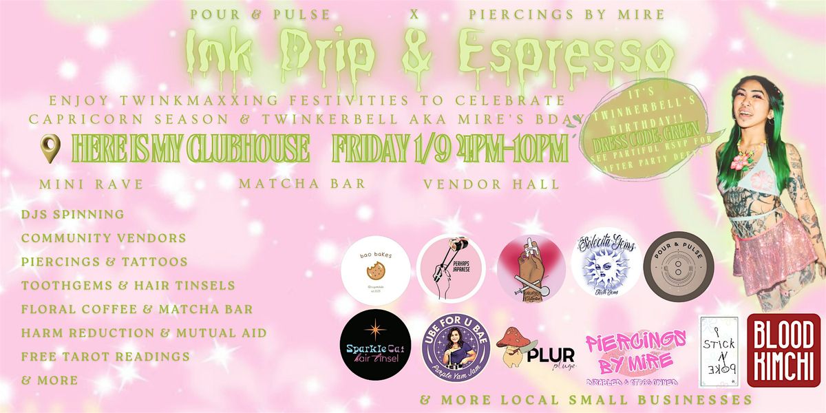 Celebrate Twinkerbell aka Mire’s twinkmaxxing bday featuring community vendor halls curated by Mire including a body mod room with tattoos, piercings, toothgems & hair tinsels, art and trinket vendors, harm reduction suppliers, free tarot readings, and more! Our matcha bar provided by Pour and Pulse will feature a gorgina menu with floral matcha and coffee beverages prepared exclusively for Mire’s bday!