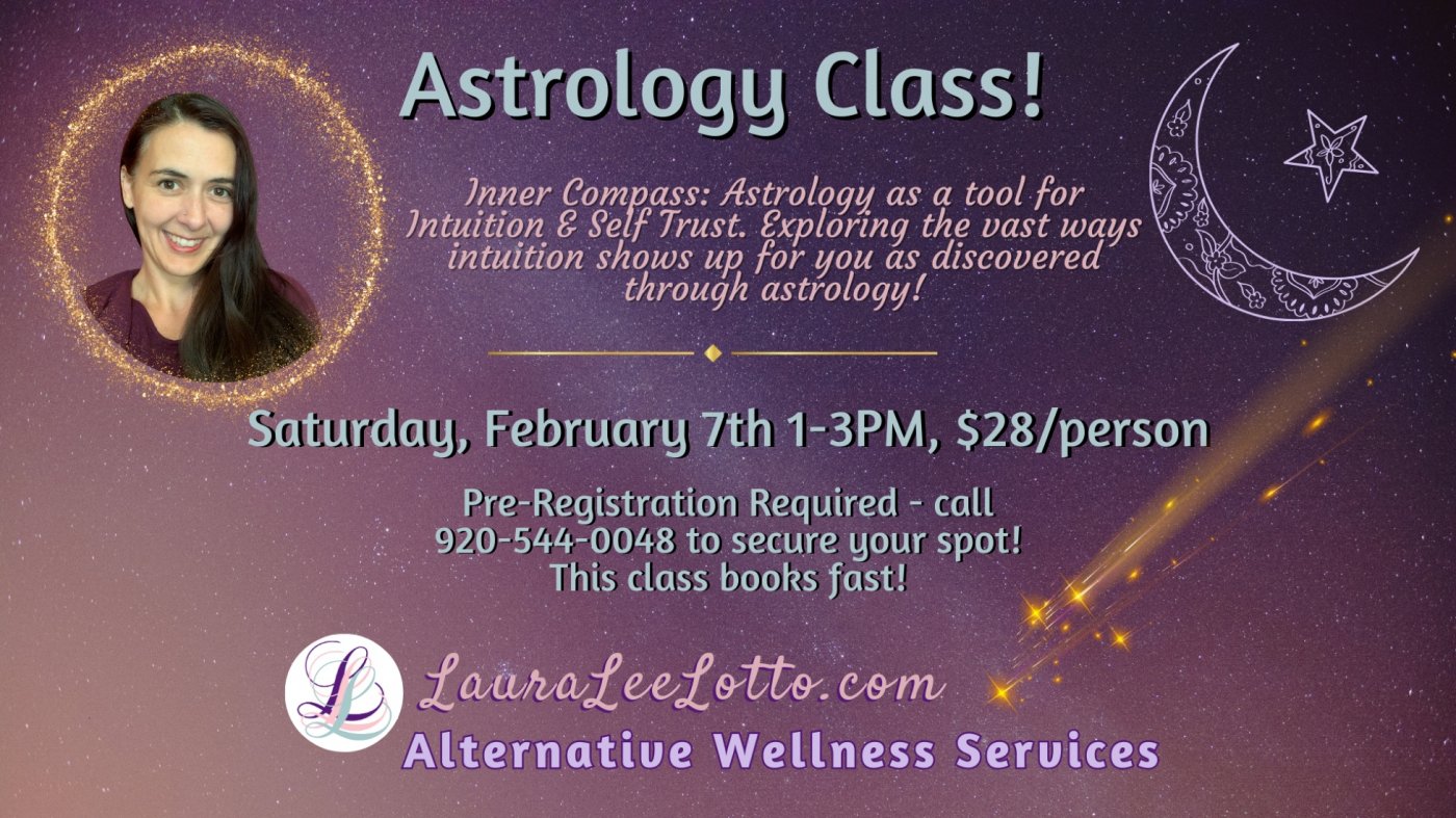 Please call 920-544-0048 to register with your Name, DOB, Time and Location of Birth in order to have your natal chart printed for your arrival.