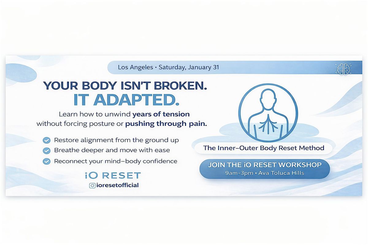 iO Reset is a body-based workshop designed to help you release tension, restore alignment, and reconnect with your mind–body connection from the inside out.