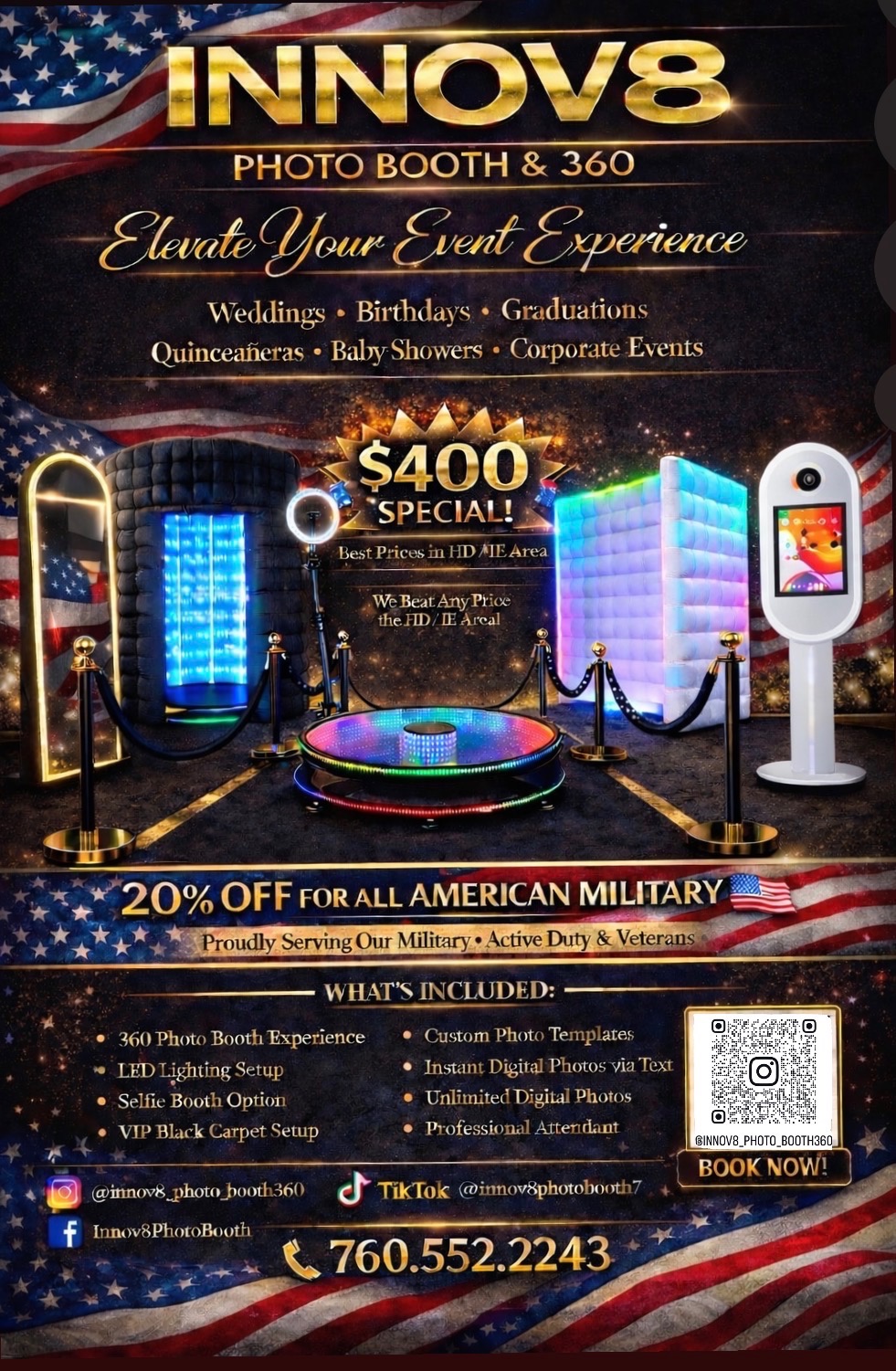 Make your event unforgettable with Innov8 Photo Booth 360, the #1 360 photo booth rental in Hesperia, Victorville, and the Inland Empire. We specialize in capturing high-quality, slow-motion videos that bring your party to life!