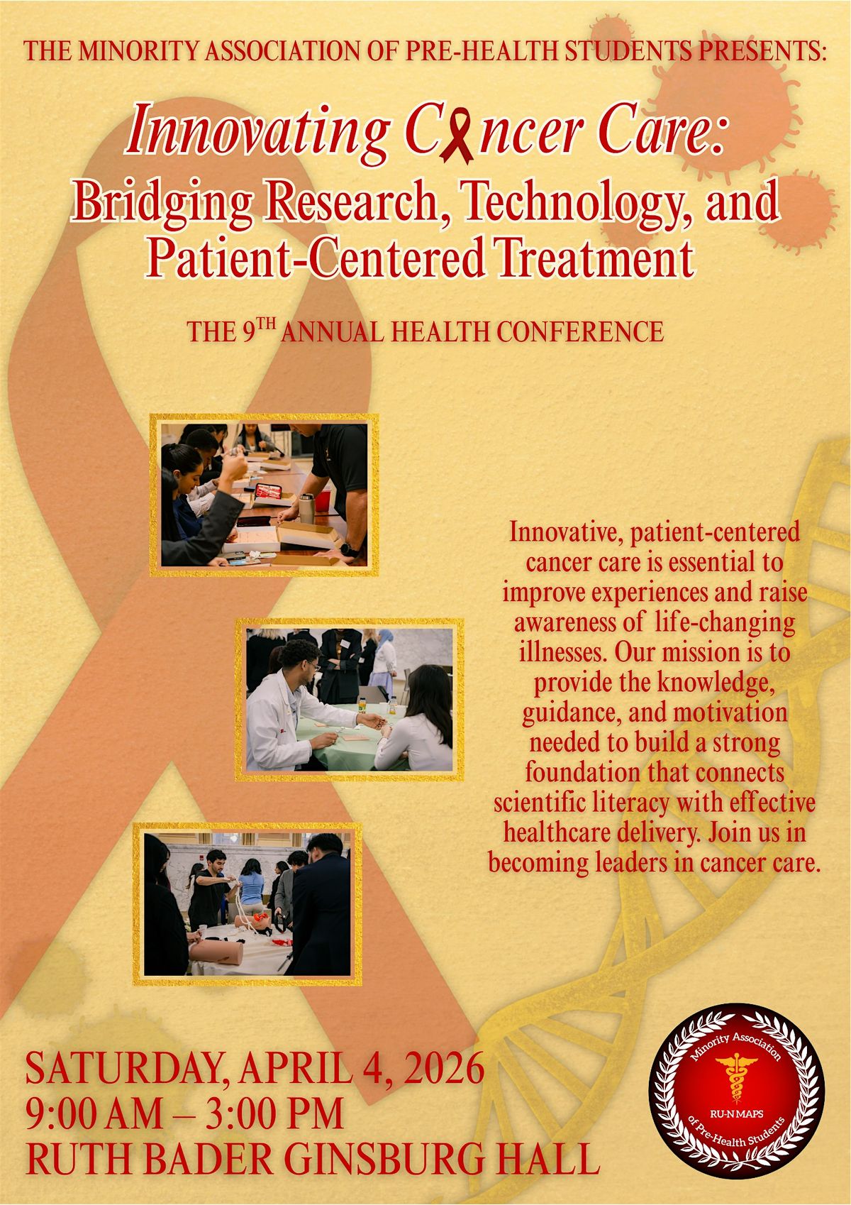 The focus of this year is in innovating cancer care to enhance patient's experiences and bring awareness to a serious and life-changing illness with an inspiring scientific and patient centered perspective. Our 9th Annual Health Conference, Innovating Cancer Care: Bridging Research, Technology, and Patient-Centered Treatment, is dedicated to equipping students with the knowledge of a world wide health issue combined with necessary tools to equip them in their pre-health journey. The conference will feature inspiring speakers, hands-on workshops, and practical resources tailored to support students at every step of their journey.