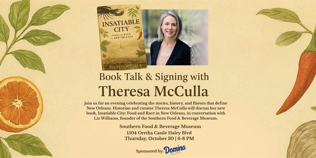 Join us at the Southern Food & Beverage Museum for an evening celebrating the stories, history, and flavors that define New Orleans. Historian and curator Theresa McCulla will discuss her new book, Insatiable City: Food and Race in New Orleans, in conversation with Liz Williams, founder of the Southern Food & Beverage Museum.