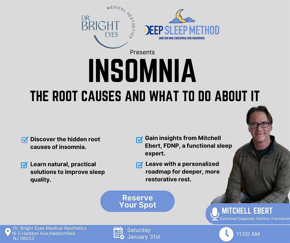 Are sleepless nights keeping you up? Join us at the Dr Bright Eyes to learn about the root causes of insomnia and discover effective strategies to tackle it. Our expert Mitchell Ebert, FDNP from the Deep Sleep method will delve into the various factors that contribute to sleeplessness and provide practical solutions to help you get the rest you deserve. Don't miss this opportunity to gain valuable insights and take the first step towards a better night's sleep!
