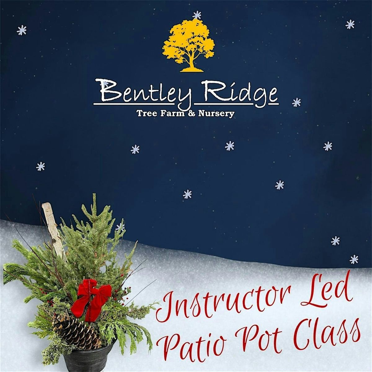 Come join us for a fun and festive event at Bentley Ridge Tree Farm! Get into the holiday spirit by creating your own beautiful Christmas Patio Pot to decorate your outdoor space. Our expert staff will provide step-by-step guidance and hands on assitance to help make your patio pot your own! Through the process, we will provide all the materials you need at the times you need them to make a stunning holiday arrangement. Bring your friends and family for a creative and memorable experience. Don't miss out on this opportunity to add a personal touch to your holiday decor!