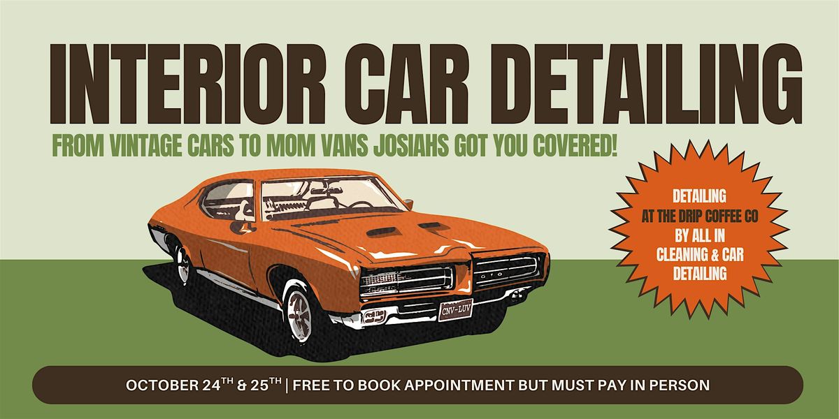 Interior car detailing by Josiah with All In Cleaning and Car Detailing happening at The Drip Coffee Co. Josiah started out by discovering his little ones make quite a mess in the car so he decided to treat his wife by detailing the interior of the vehicle and thought why not help others. If you're overwhelmed, no time or just not your thing, schedule an appointment today and let Josiah take care of the cleaning. Afforable interior detailing while you get your sips and eats inside The Drip Coffee Co. *The Drip does not allow outside food and drinks including snacks from home.