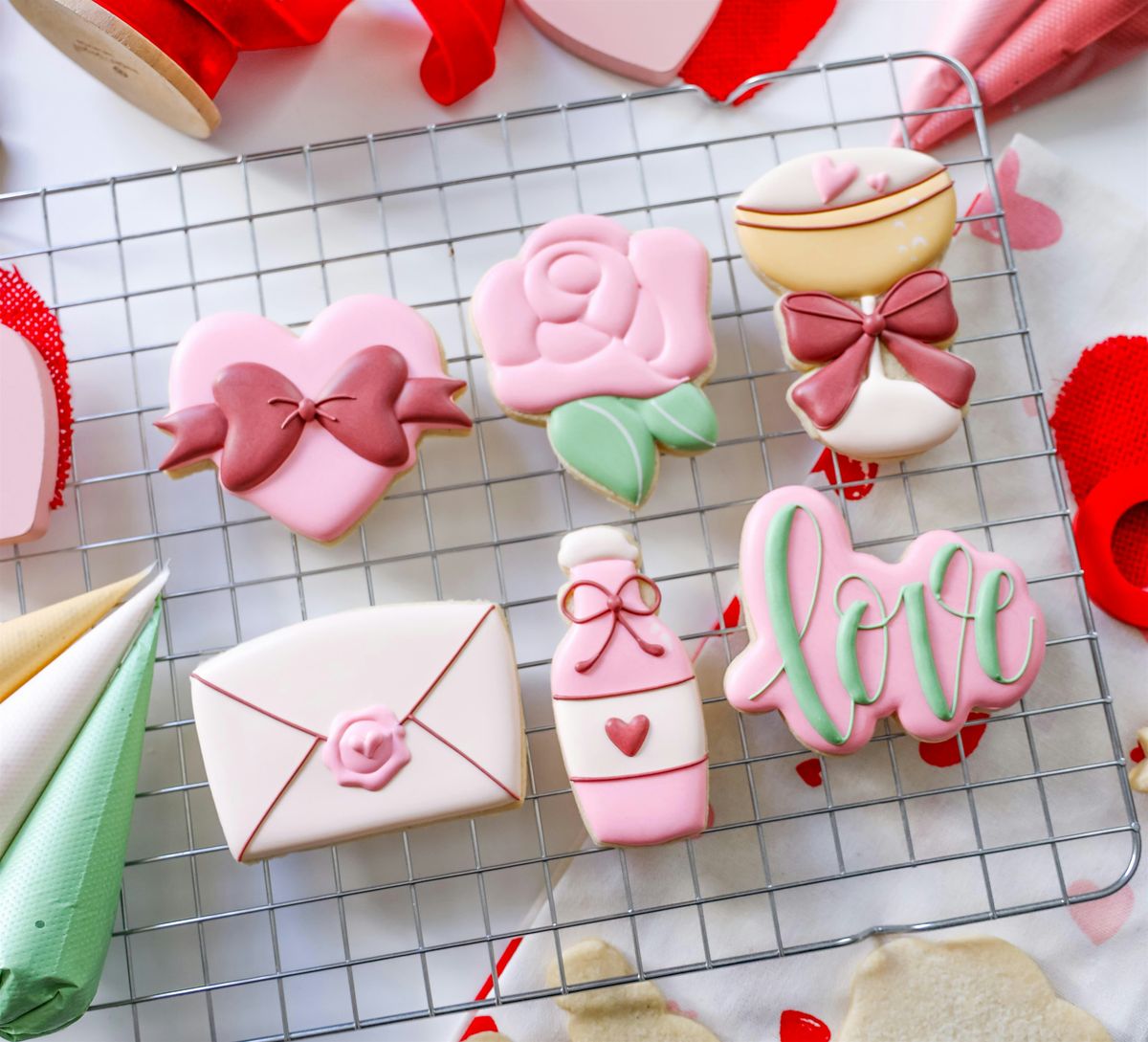 We’ll be decorating six Valentine’s-themed cookies using techniques designed to build control, consistency, and design flow. You’ll heart this edible art!