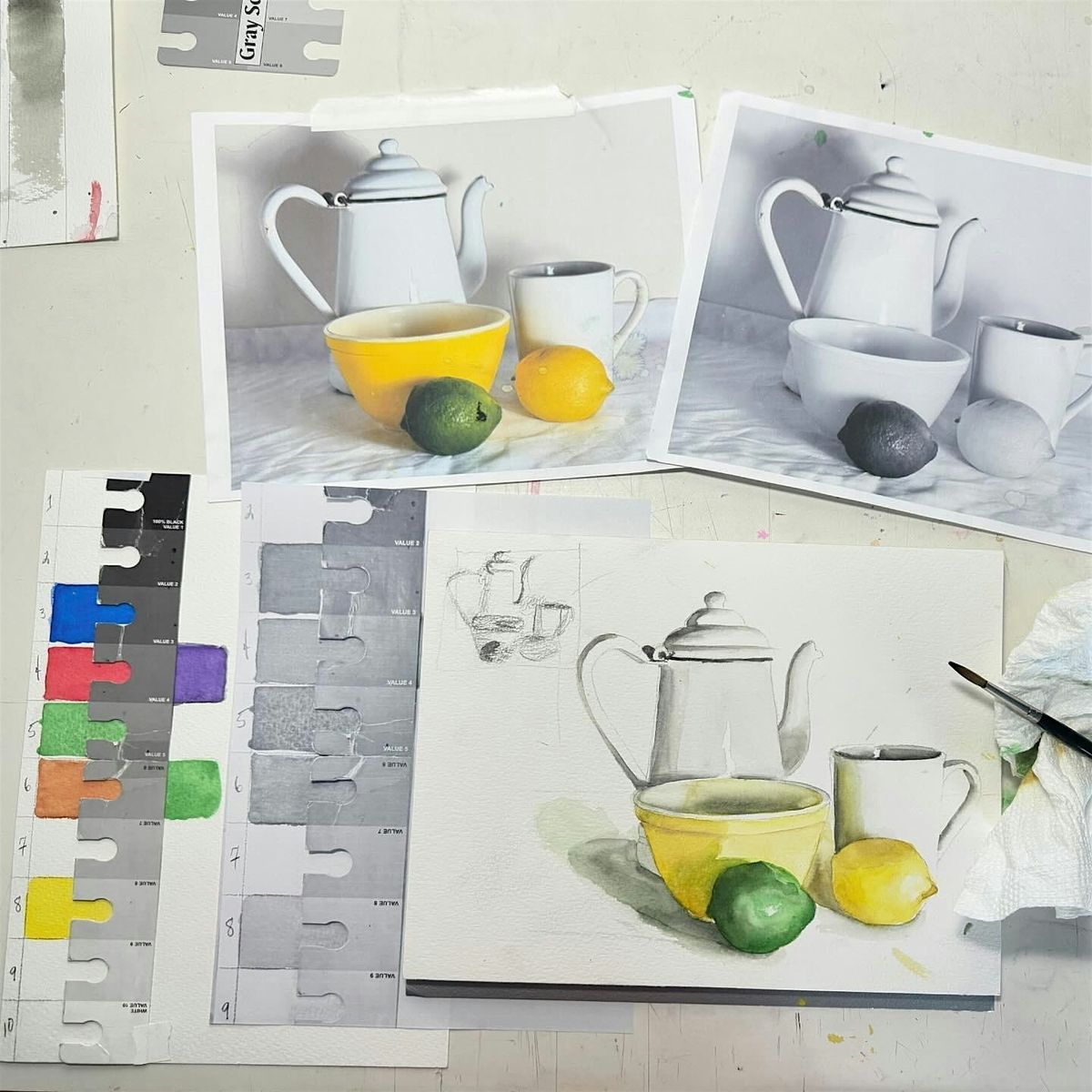 This class is for people who already have experience with watercolor painting. We take the study of value in composition further, with a focus on value in color. We learn basic drawing methods and practice drawing and painting from life. Each session will offer different subject matter to practice seeing value in color from life.