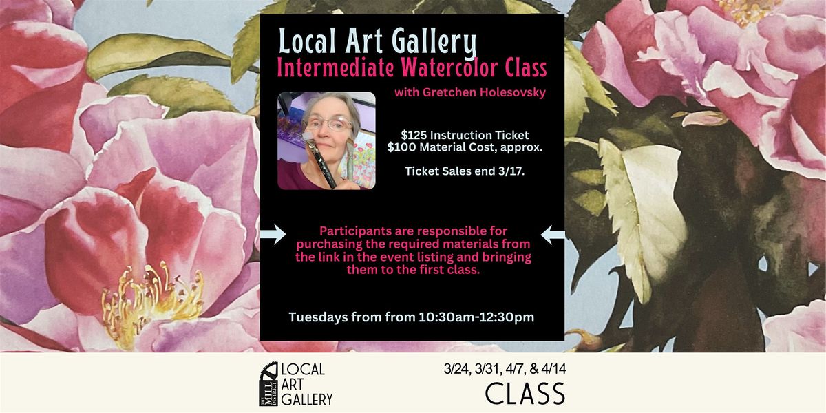Join Belchertown artist, Gretchen Holesovsky, at The Mill District Local Art Gallery for a series of four intermediate watercolor classes. An exploration of styles and expression will enhance your creative muse no matter how you choose to create. This series is jammed packed with information and has homework. Great for individuals who took Gretchen's beginning watercolor series as well as intermediate artists who want to deepen their understanding of painting with watercolor.