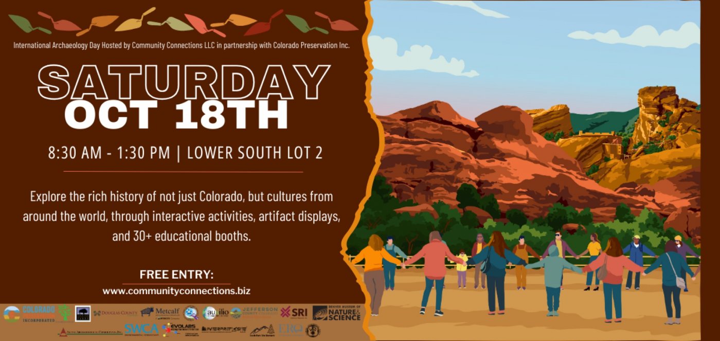 On Saturday October 18th from 8:30-1:30 pm join us at Red Rocks Park & Amphitheatre (Lower South Lot 2) for International Archaeology Day a FREE event hosted by Community Connections LLC in partnership with Colorado Preservation Inc. Explore the rich history of not just Colorado but cultures from around the world through interactive activities artifact displays and 40+ educational booths. Highlights include atlatl throwing a tipi demonstration Indigenous dancing and 3 professional speakers! We also have a beer garden for adults root beer for kids and three food trucks. Plus enjoy free offsite cultural tours!
